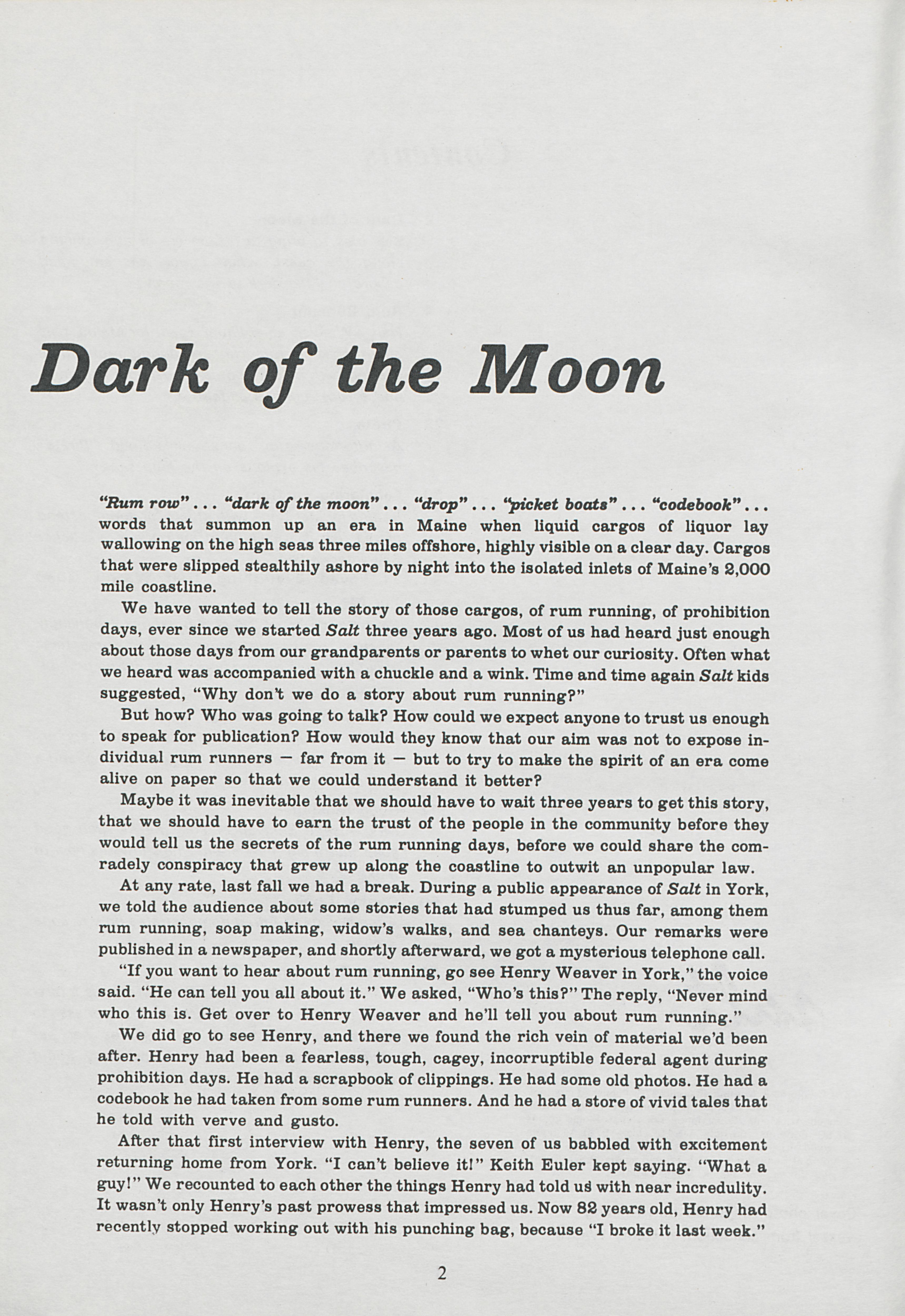 Pamela Wood introduces readers to stories in the April 1976 Salt Magazine related to rum running.